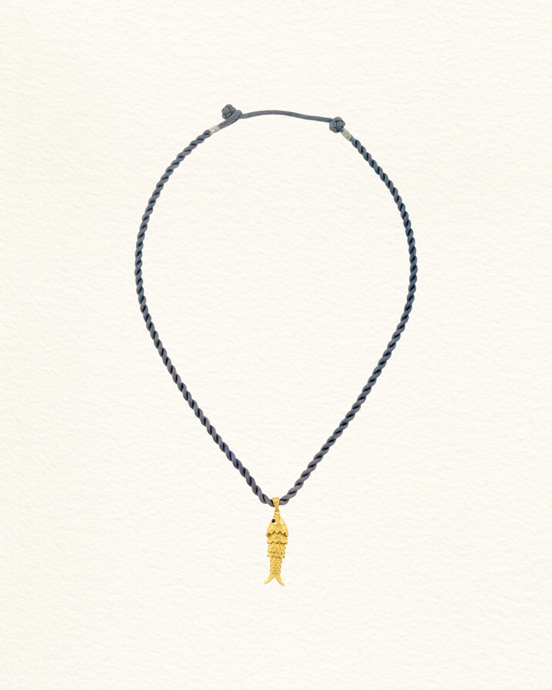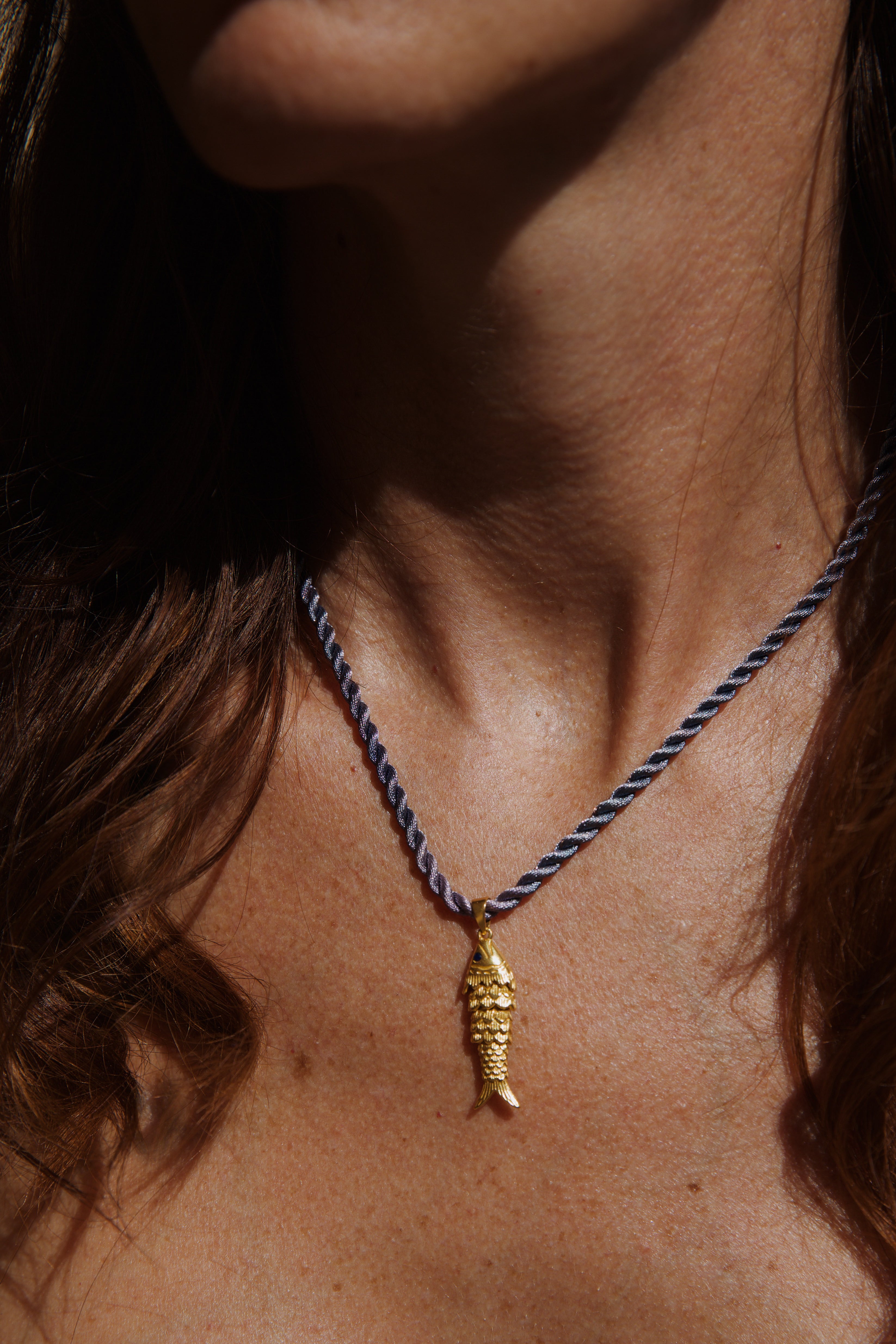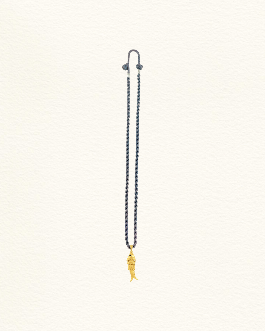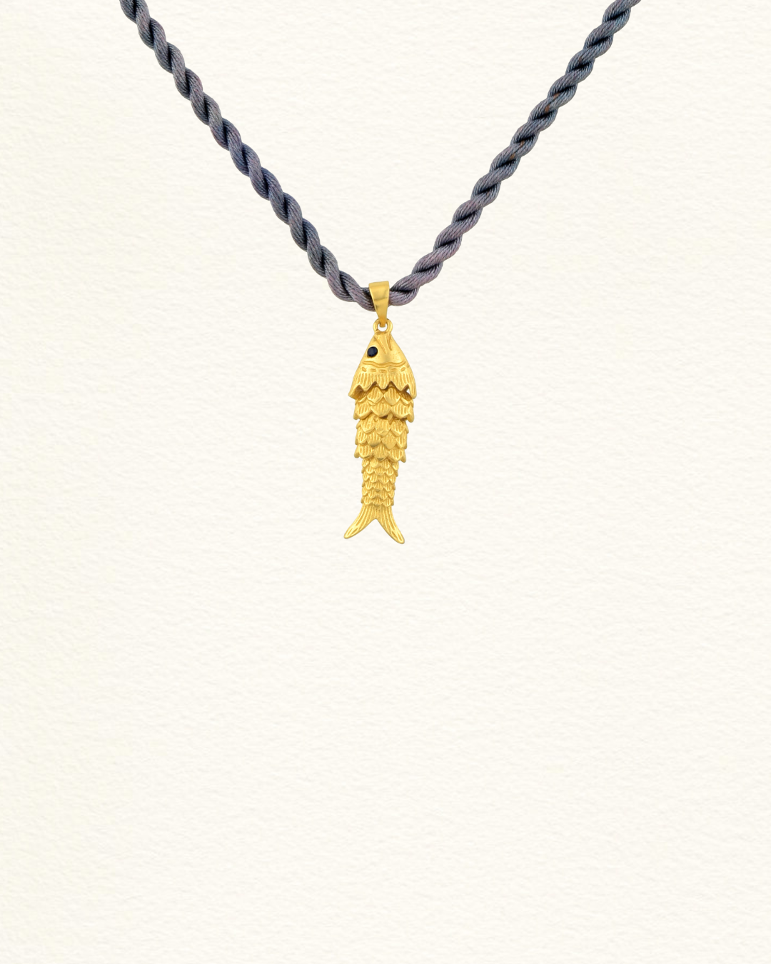Pendentif poisson articulé, finement sculpté en plaqué or. Sa forme articulée lui confère un mouvement fluide et vivant autour du cou.