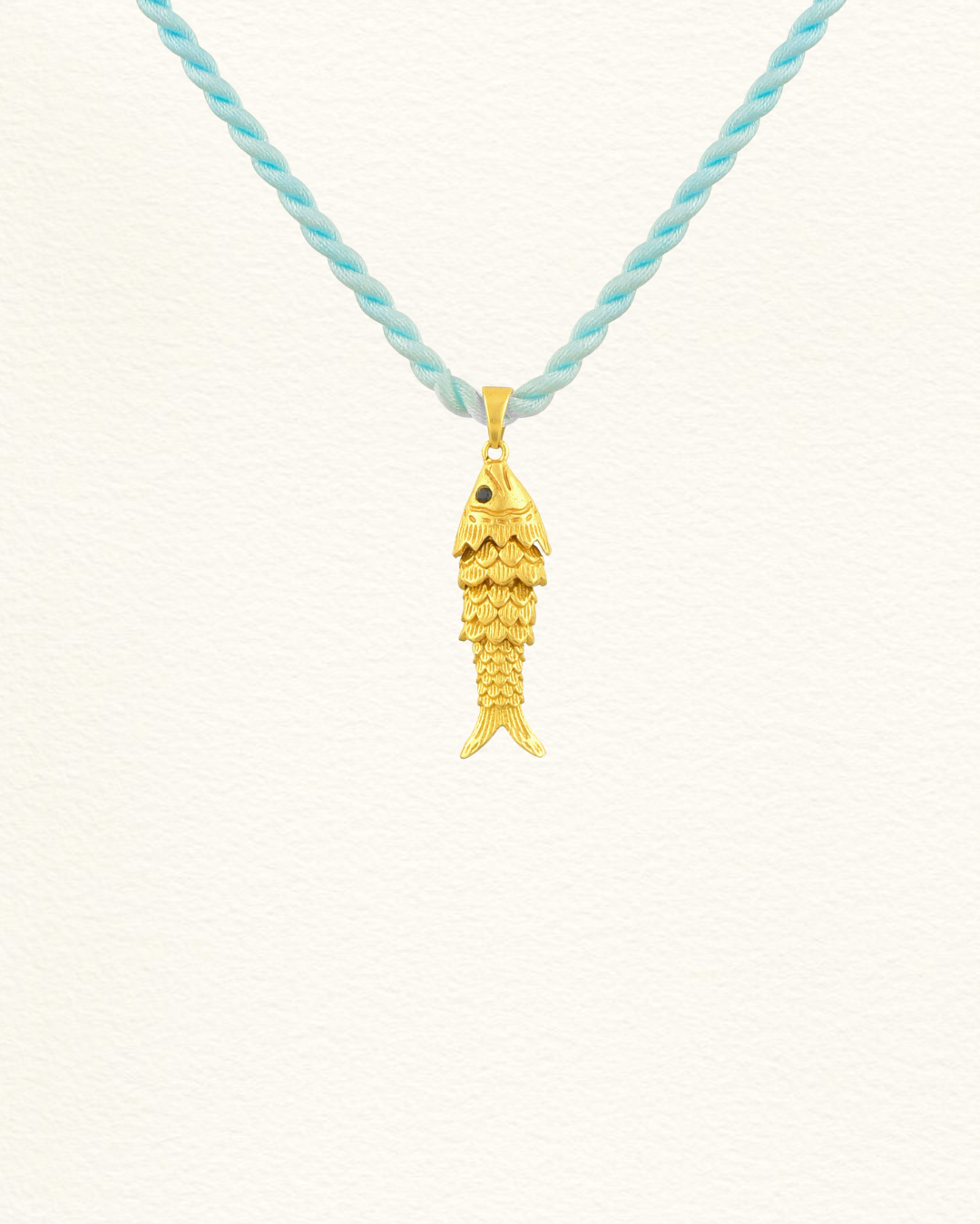 Pendentif poisson articulé, finement sculpté en plaqué or. Sa forme articulée lui confère un mouvement fluide et vivant autour du cou.