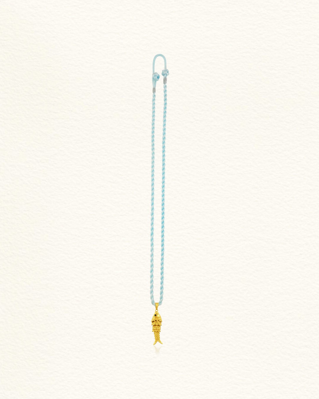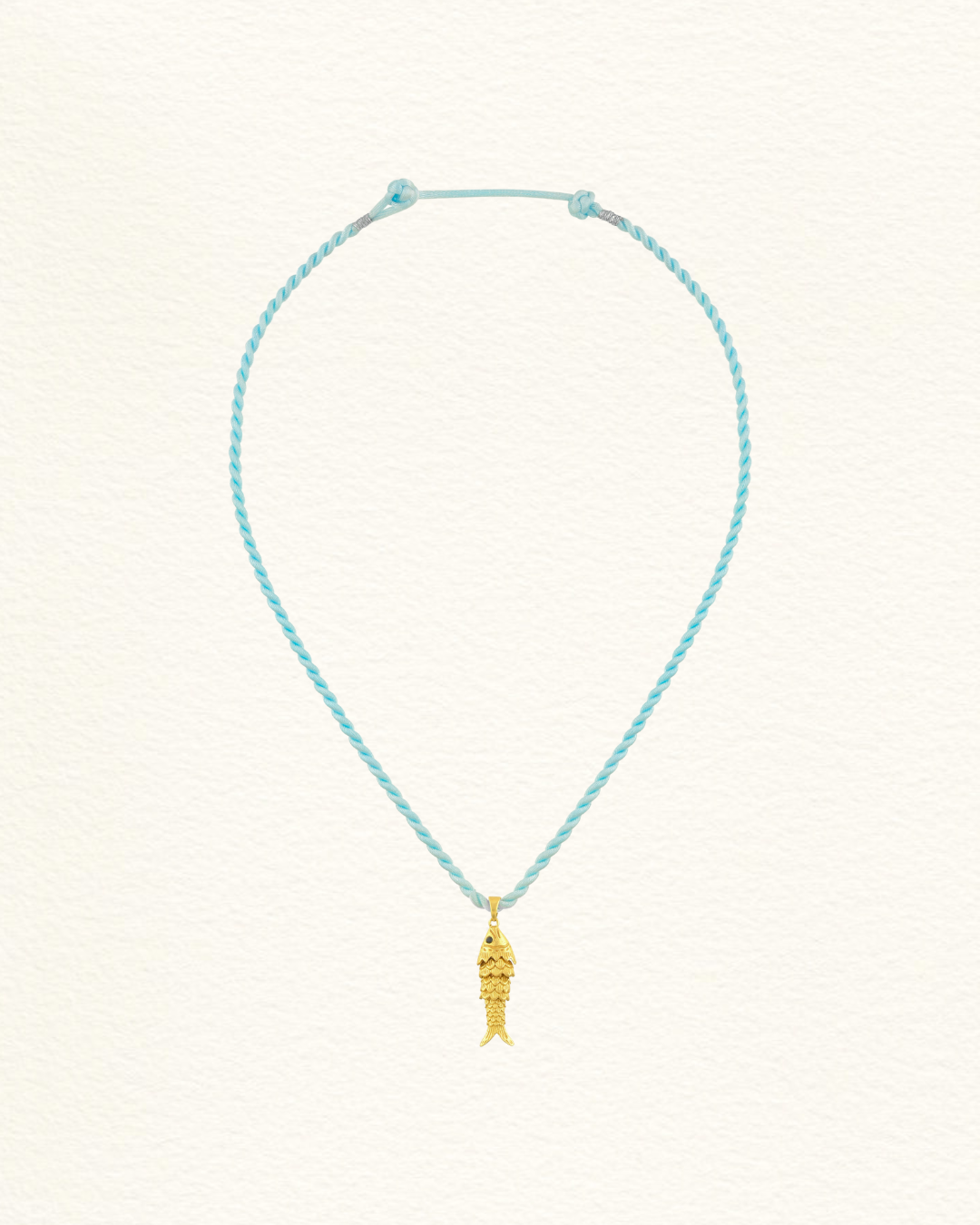 Monté sur un cordon tressé bleu clair, ce collier s'ajuste à deux longueurs : 40 cm pour un porté ras de cou, 45 cm pour un tombé plus libre.